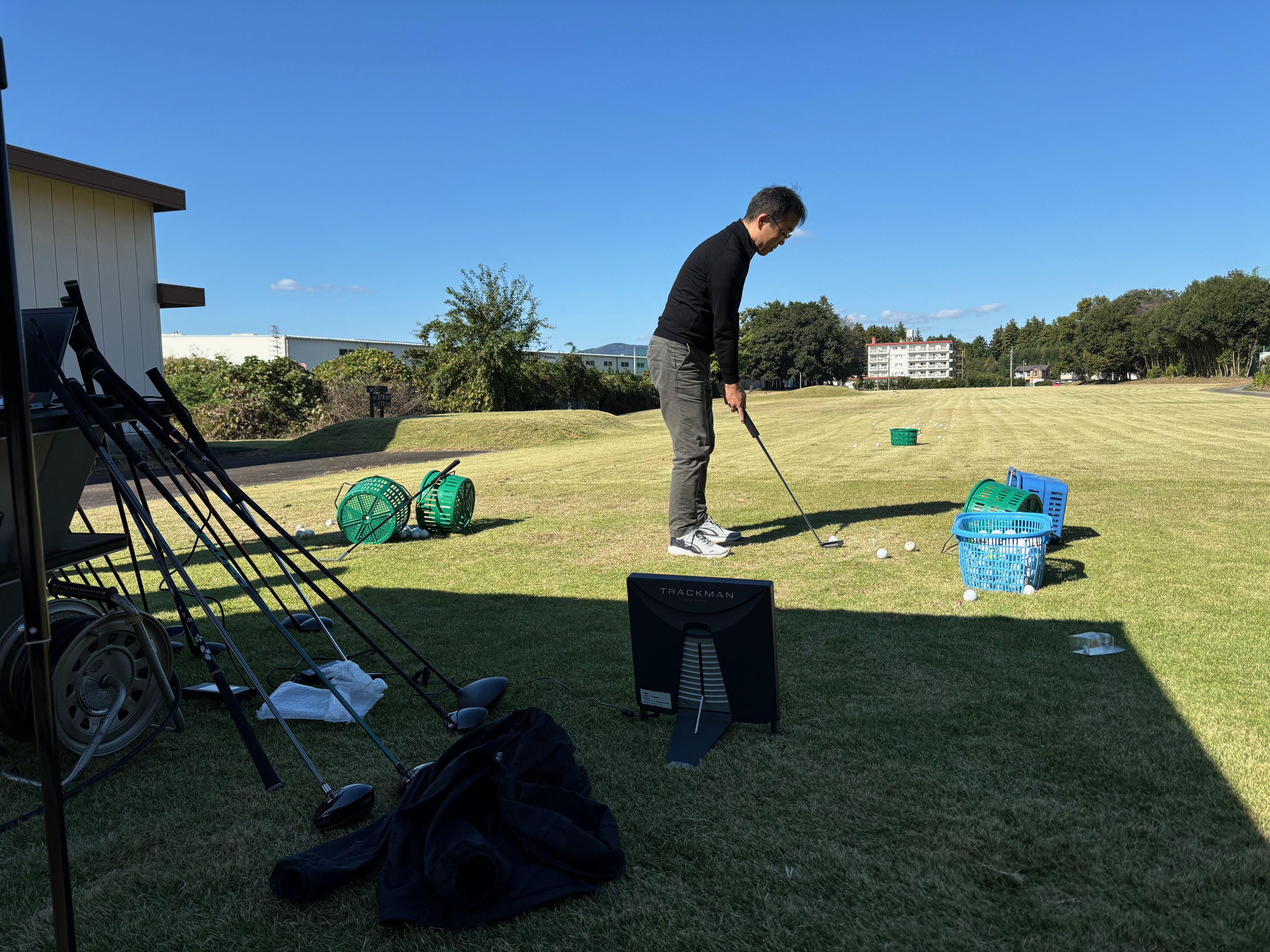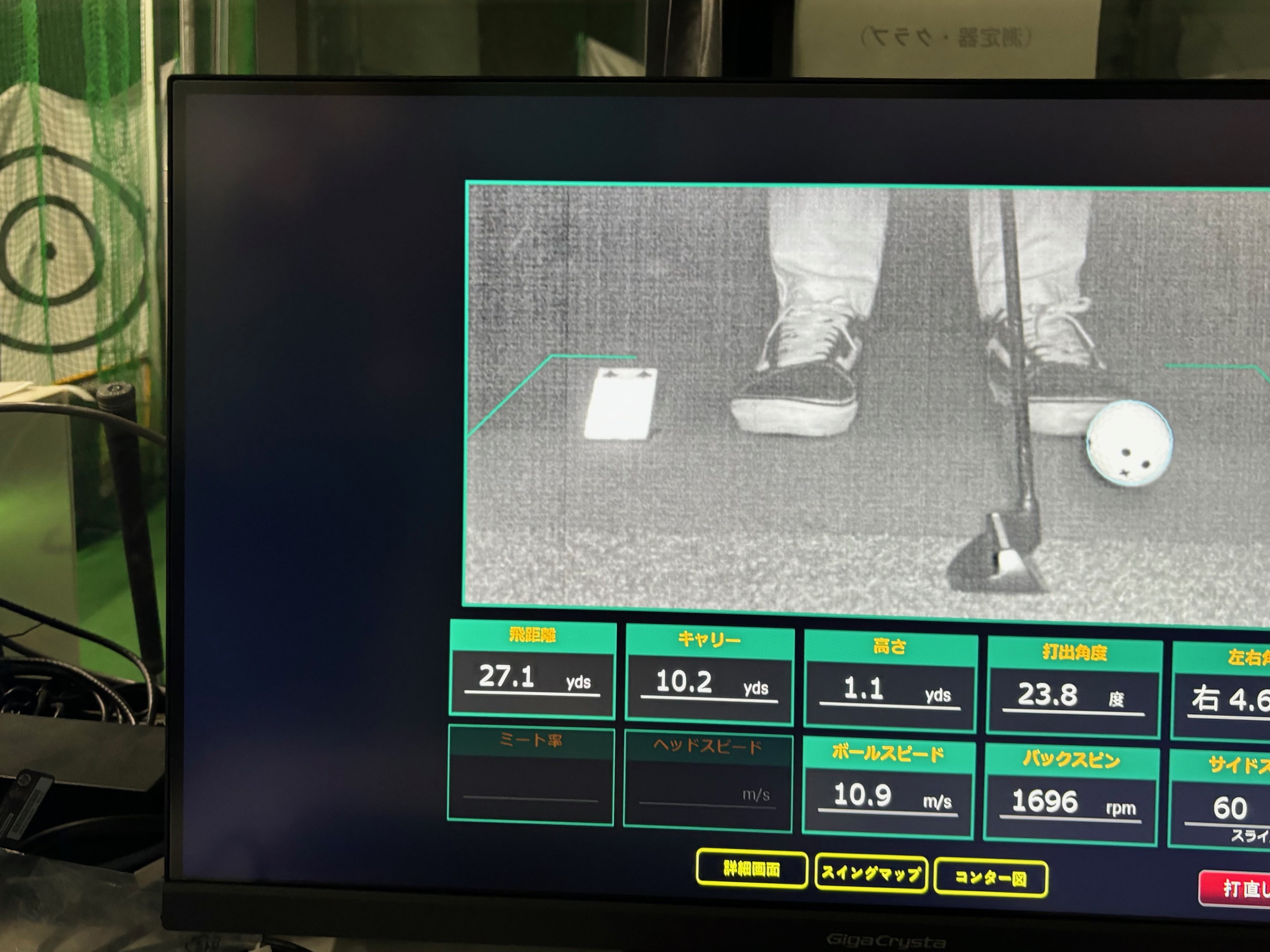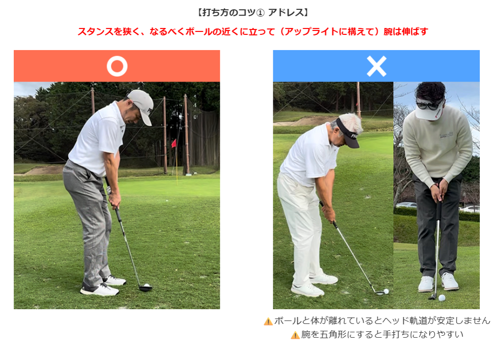 ミスが出る人の多くは、ボールにヘッドを当てようとするために、ヘッドをしゃくり上げるような動きが強く出ていました。また、スタンスとボールの位置が離れているため、重いヘッドを横降りしてしまうことで打点がばらついていたのです。