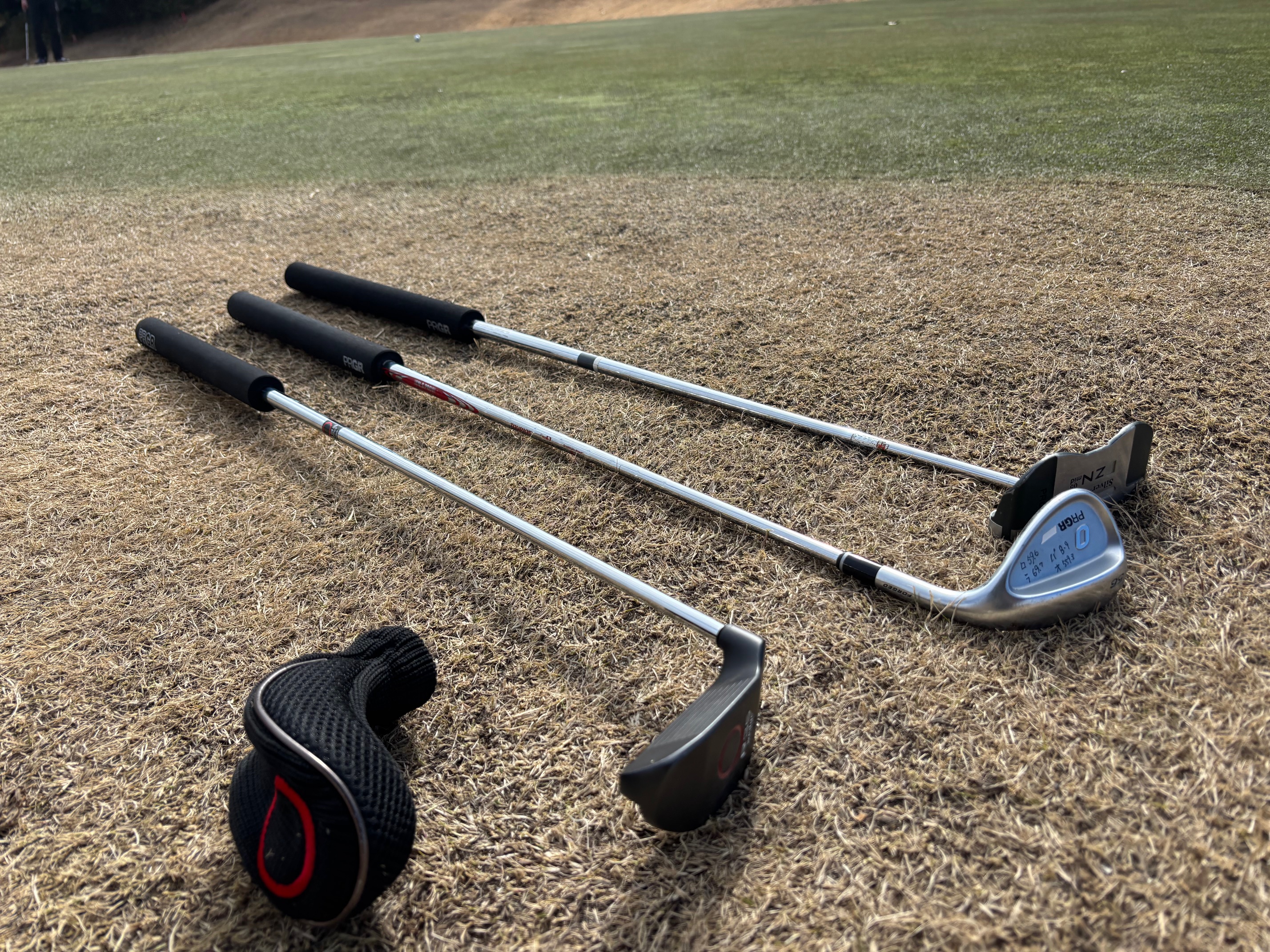 さらに太グリップをR35ウェッジだけでなく、パターやアプローチウェッジにも装着してみてフィールドテストを実施。パターにいれると重みがあるので、自然とゆったりとしたストロークになり、インパクトでパチンと手を使ってボールに当ててしまう癖を防いでくれて距離感が安定。アプローチウェッジもR35ウェッジでは難しい砲台グリーンやバンカー越えの場面で役に立つので、いつしかこの3本セットはショートゲームが苦手なスタッフにとって、ラウンドの際には手放せないクラブとなっていました。