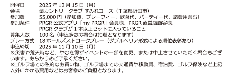 (株)プロギアは、日頃からプロギアをご愛顧いただいているファンの皆さまとの交流を目的とした感謝イベント「Smilin' PRGR DAY(スマイリン・プロギア・デイ)2025」を、12月15日(月)に紫カントリークラブ すみれコース(千葉県野田市)で開催します。当日はダブルぺリア方式による18ホールズストロークプレーのゴルフコンペを行うほか、PRGR契約プロの平塚哲二、谷原秀人、金田直之、森田理香子、辻梨恵、小林夢果、内藤雄士などの豪華ゲストも参加し、ファンの皆さまにプロのショットを間近で体感いただけるドラコンやニアピン対決などを企画しています。このほか、最新クラブの試打会やゴルフのお悩みを解消するレッスン会、トークショーなどを通じてファンの皆さまが笑顔となる一日をご提供したいと考えています。なお、同イベントへの参加申込は、11月10日(月)までPRGR WEB内の「Smilin' PRGR DAY」申込ページで受け付けています。