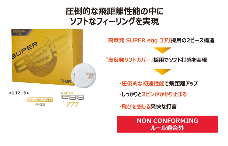 「SUPER eggボール」は、ルール適合モデルを大幅に超えた初速性能を発揮する「高反発 SUPER eggコア」と、従来品よりもソフトなフィーリングを可能にした「高反発ソフトカバー」の採用により、ルール適合外の圧倒的な飛距離性能とアプローチ時の安定したスピン性能の両立を実現しています。同時に発売する飛びの可能性を徹底追及した「SUPER eggドライバー」「SUPER eggフェアウェイウッド」「SUPER eggユーティリティ」と同様、ゴルフを生涯楽しみたい、とにかく飛ばしたいといったゴルファーのためのボールになっています。