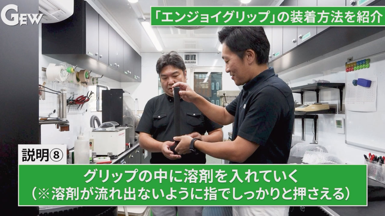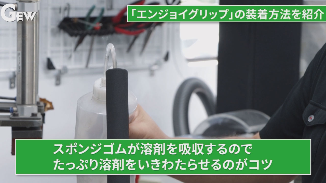 スポンジゴムが溶剤を吸収しやすいので、溶剤をグリップ内部にたっぷり行き渡らせ、素早くシャフトに装着してください。(時間が経つと装着しづらくなります)