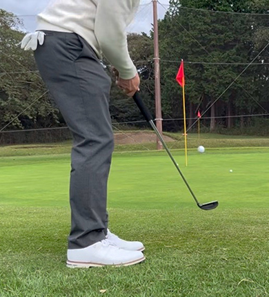 打ち急がず、クラブの重みを感じながらゆったりしたリズムでストロークする。(フォローの大きさで距離感を出す)