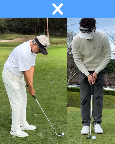 スタンスを狭く、なるべくボールの近くに立って(アップライトに構えて)腕は伸ばす